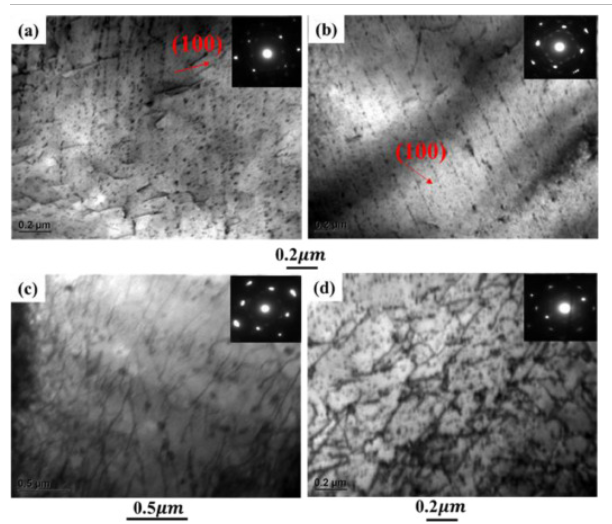 图7 透射电镜明场显微照片显示不带电和带电的微观结构,没有应变应用,(a,c)在钛钼钢和(b,d)在钒钼钢。(a,b)来自不带电大块样品的低密度随机分布位错;(c,d)带电体样品的位错密度显著增加