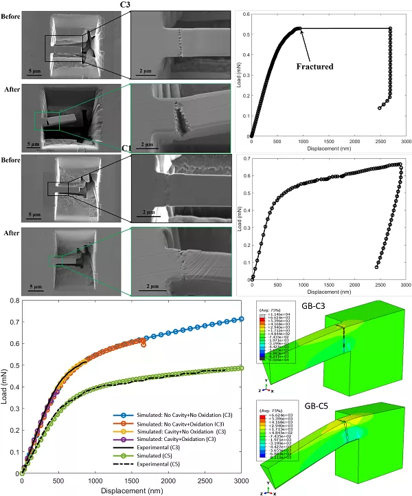 图4:690镍基合金纳米孔洞晶界的微米力学测试以及对应的有限元仿真。