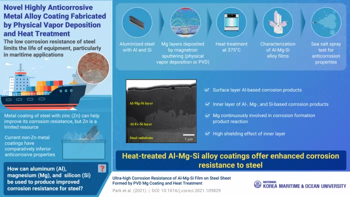 因此,韩国海事海洋大学(KMOU)的工程师开发了一种由铝、镁和硅(Al-Mg-Si)组成的新型合金涂层。该团队从镀铝钢开始,也就是在铝和硅的浴液中热浸的钢,对于缺少的成分“镁”不能通过这种方法来实现,所以该团队使用物理气相沉积法为钢进行涂层。最后,涂层被暴露在375°C的高温下,持续不同的时间。