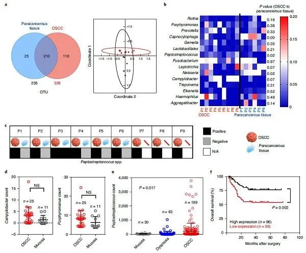 汉大学的张先正教授和孙志军教授(共同通讯作者)等人发现在口腔鳞状细胞癌患者的肿瘤中,较高水平的消化链球菌属细菌能够大概率地进行长期生存。基于这一现象,作者在小鼠OSCC肿瘤中注入OSCC患者的口腔微生物群,进一步基于消化链球菌的代谢特征,设计了含银纳米粒子黏膜粘附性水凝胶对口腔中其他细菌的生长进行抑制,而不影响消化链球菌的增殖。因此使得抑癌的消化链球菌在口腔菌群中占据了优势地位。这一研究表明,理性设计的生物材料可以特异性的调节人类微生物群,以增强抗肿瘤免疫反应。本文第一作者为郑迪威和邓伟伟,研究成果以题为“Biomaterial-mediated modulation of oral microbiota synergizes with PD-1 blockade in mice with oral squamous cell carcinoma”发布在国际著名期刊Nature Biomedical Engineering上。