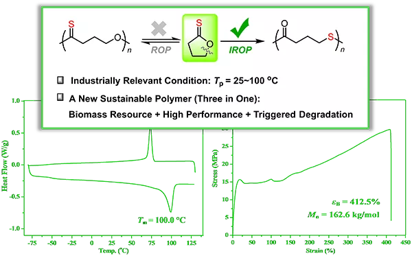 据中科院官网报道,中国科学院上海有机化学研究所金属有机化学国家重点实验室研究员洪缪研究团队在基于非张力五元环硫羰代内酯制备可持续性高分子材料的研究中取得新进展。该工作以五元环内酯为原料,尽管这是一类价廉量大的可再生化合物,然而“非张力”环结构导致了它们的环张力小、开环聚合缺乏驱动力,过去常被称为“不能聚合”的单体。科研人员通过单体设计,一步硫化反应将硫原子引入五元环内酯中,以接近定量的收率合成新型五元环硫羰代内酯单体,并利用其开环过程选择性的发生alkyl-oxygen键断裂和S/O异构化的协同反应,而不是常见的acyl-oxygen键断裂,构建了一种不可逆开环聚合(IROP)的新策略。与传统的开环聚合(ROP)的本质差别在于,该策略以异构化反应为热力学驱动力,而不是环张力,从而促使这类非张力环单体在室温甚至是高温下发生聚合,为工业化合成基于五元环内酯的可持续性高分子提供了可能。研究发现,磷腈强碱tBu-P4/Ph2CHOH催化体系能有效抑制二聚和回咬副反应,可高活性地催化γ-硫羰代丁内酯及其甲基衍生物在工业温度下(80–100 °C)的IROP,即使是在单体大比例过量的条件下(1600当量),4-6小时内可完成单体的定量转化,得到数均分子量高达251.0 kg/mol的聚硫酯。理论计算研究表明,催化体系中的Ph2CHOH组分在聚合过程中起着独特的质子转移引发和抑制回咬副反应的双重作用,保证了聚合的可控性;此外,alkyl-oxygen键断裂和S/O异构化的协同反应会生成热力学稳定的产物,为聚合反应提供热力学驱动力。物理性能测试表明,该工作合成的聚(γ-硫代丁内酯)是具有高熔融温度(~100 °C)的结晶性塑料,断裂伸长率和拉伸强度分别为412.5%和30 MPa,其热性能与机械性能可与商业化的低密度聚乙烯相媲美,并能在外界刺激触发下发生高效可控的降解,是一类新型的高性能可持续性含硫高分子材料。该工作发展了一种不可逆开环聚合的新策略,以S/O异构化反应为开环聚合的热力学驱动力,而非传统的环张力,打破了非张力环单体无法常温/高温聚合的局限,为“挑战性”五元环内酯转化成性能各异的可持续性高分子材料提供了新途径。相关研究成果以Towards High-performance Sustainable Polymers via Isomerization-driven Irreversible Ring-opening Polymerization of Five-membered Thionolactones为题,发表在Nature Chemistry上。