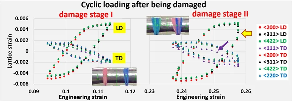 图5 含锰钢拉/压疲劳损伤的点阵应变特征:点阵应变按绿色箭头方向演化就代表损伤。