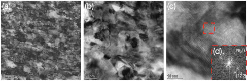 图14所示:动态再结晶层Ⅱ-a的TEM图像。(a, b) TEM BF图,(c) HRTEM图,(d) FFT图显示的Ni3Ti晶粒。