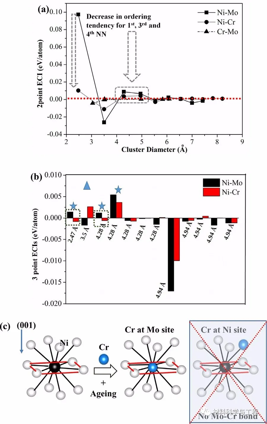 图4 (a)计算出的Ni-Mo、Ni-Cr和Cr-Mo系的相互作用参数;(b)比较Ni-Mo和Ni-Cr系的ECl值;(c) Ni-Mo合金中Cr原子的位置偏好示意图