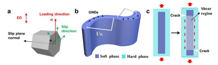 图12 (a)基底织构晶粒中的代表性晶体取向。(b)与局部GND密度相关的软相曲率示意图。(c)显示在硬相交错微裂纹形成后软相局部应力状态变化的简化模型。