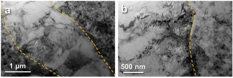 图9 拉伸试验后反MgNC的代表性TEM图像。(a)软相晶粒内的高密度位错。(b)与硬相相邻的软相晶粒中的位错堆积。黄色虚线表示软相和硬相的边界。