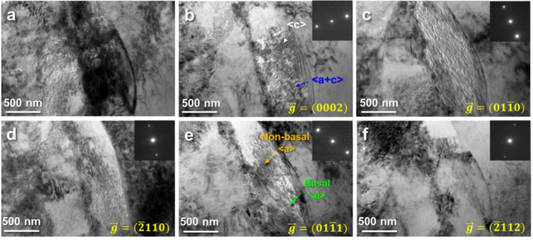 图10 变形软相晶粒中的位错配置。(a)TEM图像显示被检查颗粒的位置。(b-f)使用不同衍射矢量在同一区域拍摄的双光束TEM图像