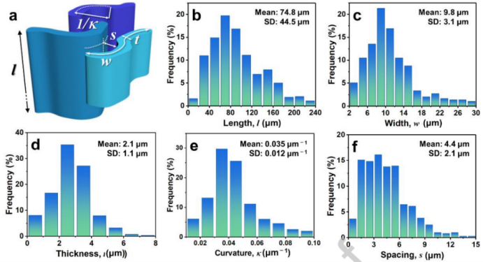 图3 软相的特征尺寸。(a)特征结构示意图。(b-f)软相的长度、宽度和厚度、曲率和间距的统计直方图。每个参数的计数超过100。