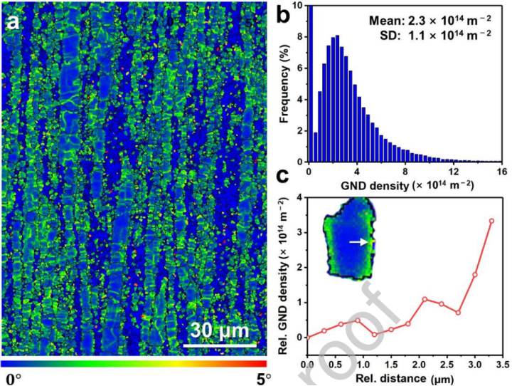 图5 反向MgNC的局部错向分析。(a)内核平均错误方向(KAM)图,KAM比例范围从蓝色到红色,代表0°-5°错误方向。(b)从相应的KAM映射结果估计的全球GND密度分布。(c)特定晶粒中的相对GND密度绘制为从晶粒中心到晶界的距离的函数。