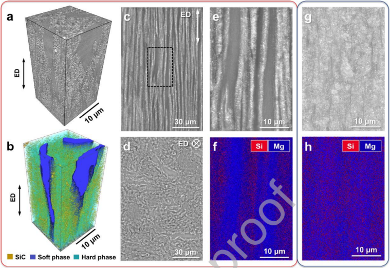 图2 (a, b)逆MgNC的3D渲染。(c, d)BSE-SEM图像分别显示平行和垂直于挤压方向的反向MgNC横截面。(e)高倍BSE-SEM图像和(f):(c)中由虚线矩形标记的区域的相应EDS元素图。(g)BSE-SEM图像和(h)均质MgNC的相应EDS元素图。