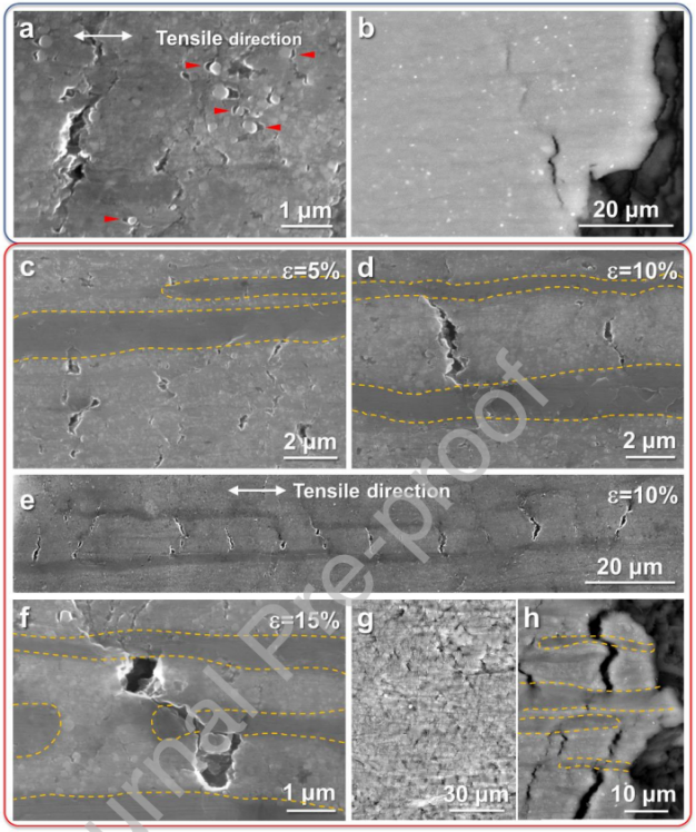 图7 反MgNC损伤演变的典型SE-SEM图像。(a, b)用于比较的均质MgNC的损伤行为。(c-f)逆MgNC中的微裂纹增殖过程随着施加的应变增加。(g)分散分布的微裂纹,表明均匀变形和变形引起的损伤。(h)断裂附近有大量钝性微裂纹,表明反向MgNC中的裂纹扩展路径。黄色虚线表示软相和硬相的边界。