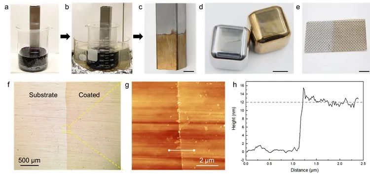 图1. 通过表面转化反应给不锈钢穿上一层致密的羟基氧化物“消毒衣”。(a) 将不锈钢棒浸入 CuSO4 和 KMnO4 的混合溶液中,(b) 在 85 °C 下加热 1 小时。(c) 在水和乙醇中清洗后,处理过的不锈钢表面呈金棕色。相同的步骤可用于其他形状的物体,例如 (d) 立方体和 (e) 网格。(f) 光学显微镜图像和 (g) 原子力显微镜图像均显示该层均匀、致密、连续且共形。(h) 该层厚度为 10 至 15 nm 之间。(c)-(e) 中的比例尺为 1 厘米。