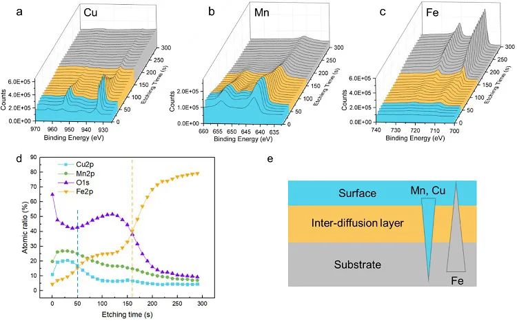 图2. 表面羟基氧化物层的 X 射线光电子能谱 (XPS) 。(a-d) 沿厚度方向Cu、Mn 和 Fe 元素XPS谱以及相应元素组成的变化趋势。(e) 沿厚度方向三个区域的示意图,包括富铜外表面(蓝色)、相互融合区(黄色)和不锈钢基底(灰色)。蓝色和灰色三角形表示界面上 Mn/Cu 和 Fe 含量的变化趋势。