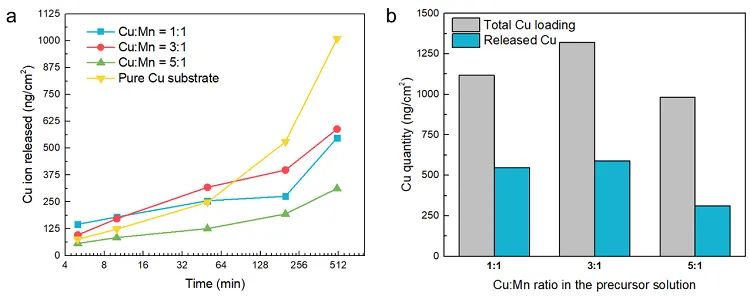 图4. 表面镀层可缓慢释放出铜离子,用以消毒。(a) 在反应中用不同比例的 CuSO4/KMnO4 制备表面层,测量其铜离子释放量,并与纯铜进行比较。(b) 对于在不同比例下制备的表面层,含铜总量和 500 分钟后的释放量。这有助于确定前驱体溶液中CuSO4/KMnO4的最佳配比。