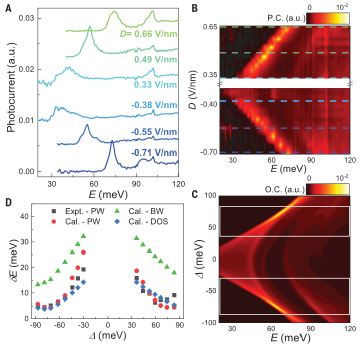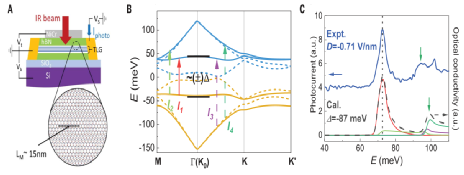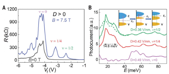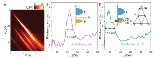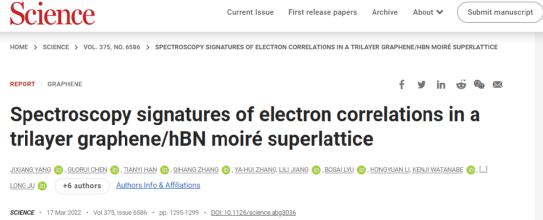 对此,来自美国麻省理工学院物理系的 Long Ju团队通过傅里叶变换红外光谱来对三层石墨烯/六方氮化硼摩尔超晶格结构进行观测。在本研究中,信噪比得到了显著改善。结果表明,当通过门腔打开带隙时,莫尔微带之间的过渡会持续变窄,表明单粒子带宽减少。在价平带的一半填充处,宽的吸收峰出现在约18毫伏电子伏处,表明一个分子受到直接光激发正在出现的莫特缺口。在另外两种相关的绝缘状态下观察到类似的光电流谱在第一个导带的四分之一和一半填充。该研究提供了三层石墨烯/六方氮化硼中电子关联的哈伯德模型的关键参数。为摩尔超晶格结构的探索以及性能调控机制的理解具有重要的意义。相关成果以“Spectroscopy signatures of electron correlations in a trilayer graphene/hBN moiré superlattice”为题发表在science期刊上。