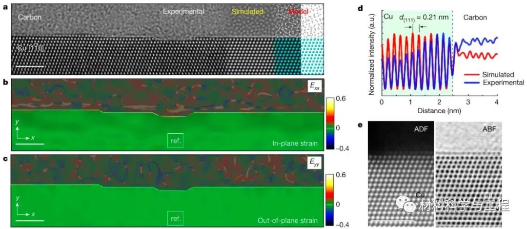 在该研究中,使用高分辨率(扫描)透射电子显微镜 (HR(S)TEM) 、结合几何相位分析 (GPA)观察了具有超平坦表面的 110 nm 厚 SCCF 的表面和结构特征,如图1所示。横截面(图1a,e)显示铜膜沿[111]方向生长,从而产生具有单原子阶梯边缘结构的暴露表面(111)平面。很少检测到典型的多原子台阶边缘和固有缺陷,例如晶界和堆垛层错。值得注意的是,最外层铜表面层具有与内部铜相同的原子构型,即使在台阶边缘位置也没有表面松弛或表面氧化引起的结构变化的迹象。为了研究表面区域附近的局部应变行为,通过 GPA 技术测量了相对于 SCCF 内部的面内 (x) 和面外 (y) 方向的晶格畸变(图 1b,c )。得到的应变场图清楚地表明,在整个表面区域中没有观察到明显的晶格应变变化。这意味着单晶Cu(111) 膜具有几乎完美的原子结构,直至其最外层表面层,没有任何结构缺陷,例如空位或位错。使用无定形碳/平面铜表面模型模拟的 HRTEM 图像与实验 HRTEM 图像非常匹配(图 1a)。通过比较模拟图像和实验图像之间的(111)堆叠平面的层间距(0.21?nm)(图1d),很明显Cu表面不变形且超平坦,并且具有与块状铜相同的结构。SCCF 表面的环形暗场(ADF)和环形明场(ABF)STEM 图像与 HRTEM 观察结果互补(图 1e)。