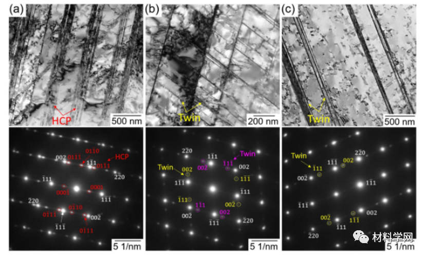 图 3a显示了10% CR 样品(图 3a)、10% CR + HT2 样品(图3b)和 10% CR + HT3 样品(图 3 c)。在图 3a中观察到高密度的非常薄的 HCP-马氏体。HCP 阶段遵循与 FCC 矩阵的方向关系,描述为 {111} FCC // (0001) HCP , <110> FCC // [110] HCP 。取向关系与钴基合金和HEA中的取向关系一致。除了 HCP-马氏体,样品中还形成了SFs 。