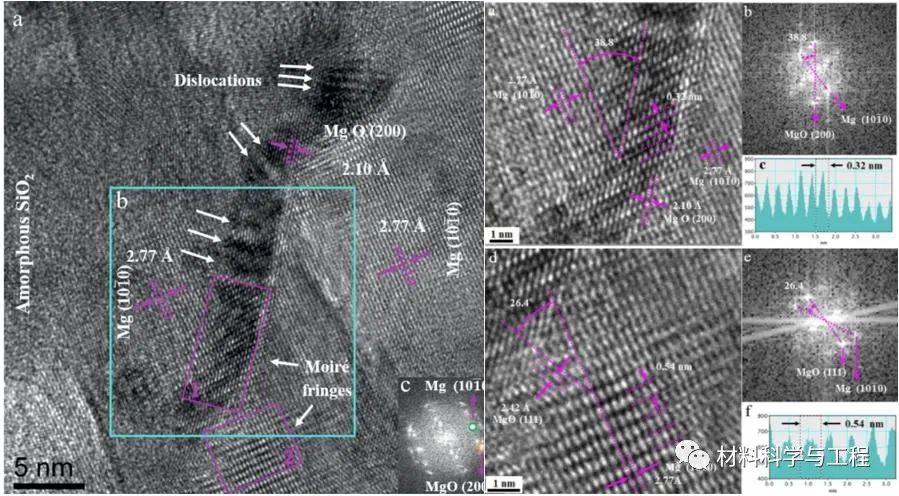 图2. Mg-SiO2镁基纳米复合材料中中非晶态SiO2颗粒增强相与晶体镁基体之间的界面表征。结果表明Mg与MgO 界面之间由于晶面旋转造成大量的位错。并且Mg与MgO之间的原子结合微弱(在图3中用第一性原理表征)。