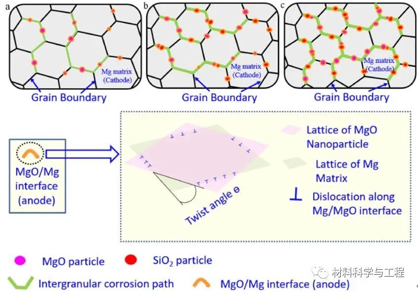 图5. Mg-SiO2镁基纳米复合材料中晶间腐蚀的主要原因是Mg/MgO界面间的应变大,原子间结合力弱,造成晶界处原子容易被腐蚀。