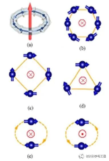 图2、由磁矩首尾相接构成铁涡矩(a)沿圆环面流动电流产生铁涡矩;(b-d)分别由6、4和3个磁矩构成的铁涡矩;(e-f)由2个磁矩构成的方向相反的铁涡矩。