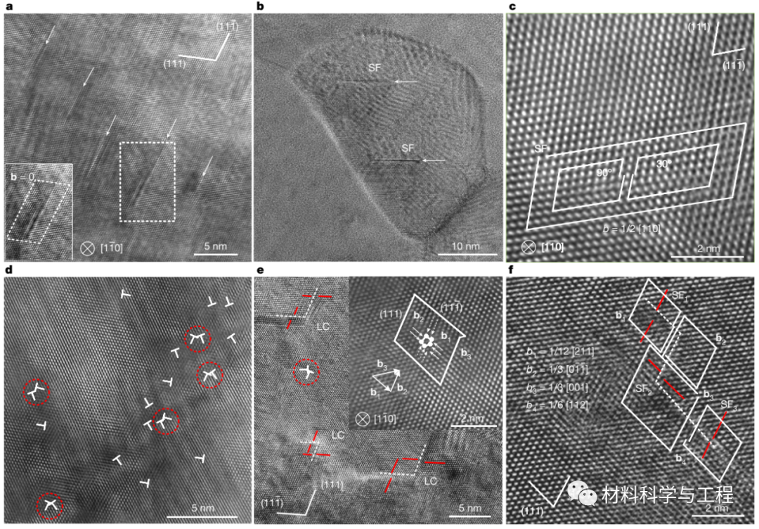 透射电子显微镜 (TEM) 观察还揭示了纳米晶粒内部位错的储存,包括部分位错,以及非解离和解离的全位错,如图3a-d所示。解离距离从几纳米到几十纳米不等(。重要的是,非解离和解离全位错的位错相互作用在变形体积中产生了许多 Lomer 锁和 Lomer-Cottrell (L-C) 锁(图3d-f)。以前在一些 HEA 中观察到了类似的位错构型。 如此高密度的移动和固定位错提供了位错障碍,造成了异常的应变硬化能力和观察到的超高屈服后流动应力,根据泰勒位错硬化方程,对流动应力贡献了大约 0.6 GPa(图2d)。同样,这种位错积累水平远远超出了 NC 金属和稀合金的正常水平,其中拉伸应变不会在纳米晶粒内存储如此高的位错密度。