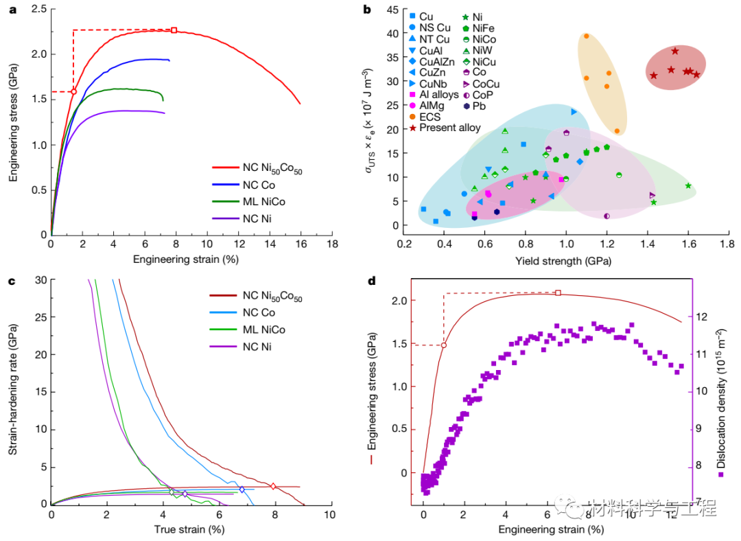 图2a和扩展数据 图5显示了工程应力-应变曲线。它们显示出高达约 1.6 GPa 的屈服强度 (σy) 和高达约 2.3 GPa 的极限抗拉强度 ( σUTS ) ,同时具有良好的延展性,拉伸断裂伸长率约为 14-16%。样品显示了剪切断裂和正常拉伸断裂的混合,具有颈缩和凹坑断裂表面,这是韧性 fcc 材料的特征(扩展数据图6)。不同批次的重复测试显示一致的结果(扩展数据图5)。与作为我们基准的基准金属 NC Ni、NC Co 和多层 (ML) NiCo 合金(参考文献 6、24、25 ,也包括在图2a 中)相比,强度和延展性同时增加。这是强化 NC 金属的显着成果,避免了正常的权衡。