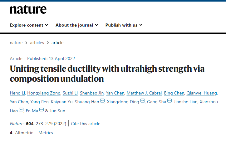 相关研究成果以“Uniting tensile ductility with ultrahigh strength via composition undulation”为题于北京时间2022年4月13日在Nature上在线发表。文章共同第一作者为吉林大学李恒博士、西安交通大学宗洪祥教授和李苏植教授。共同通讯作者为吉林大学韩双副教授、西安交通大学金属材料强度国家重点实验室丁向东教授、南京理工大学沙刚教授、悉尼大学廖晓舟教授和西安交通大学金属材料强度国家重点实验室马恩教授。