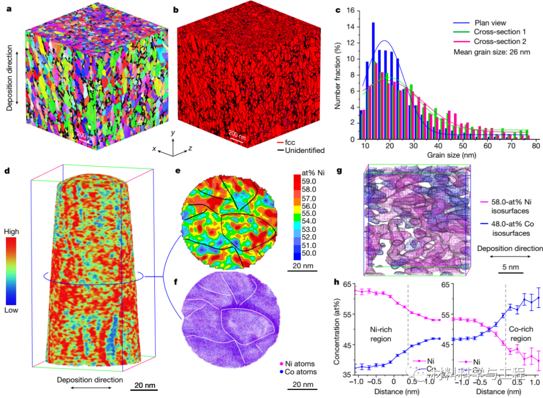 近等原子NiCo固溶体是通过电化学沉积产生的,这是一种自下而上且对工业友好的方法,可以合成多种纳米材料。这种非平衡样品制备路线有利于成分调整(方法)。沉积的样品由大致等轴的 NC 晶粒组成(图1a)并具有单相 fcc 晶体结构(图1b,扩展数据图1)。在沉积的材料中可以检测到轻微的(111)纤维织构,这是与浓溶液合金电沉积相关的典型生长织构(补充图1 ))。晶粒尺寸跨越平均值约为 26 nm 的范围(图1c)。大多数晶粒被高角度 GB 隔开(补充图2)。没有沉淀或有序相(扩展数据图2)。使用原子探针断层扫描 (APT) 进行的定量化学分析表明,整体的整体成分约为 50-at% Co(示例参见扩展数据图3)。