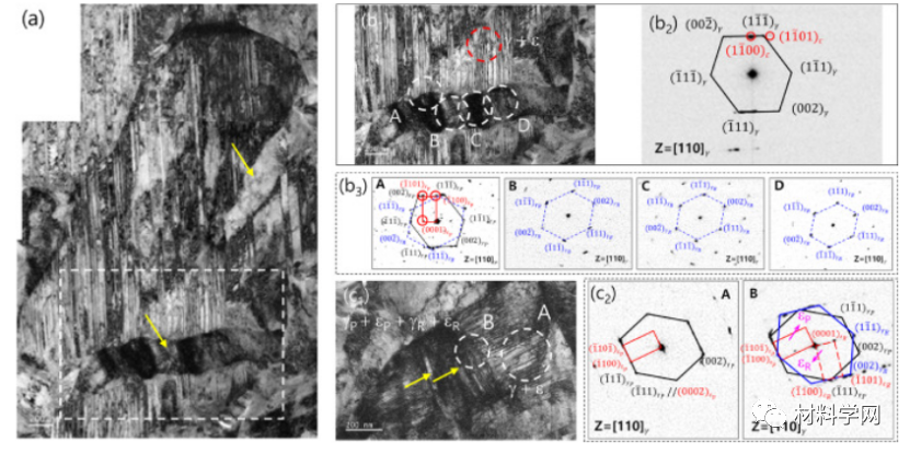 图 7。20% 应变 A600–10 的 TEM 分析。(a) TEM BF 图像显示高密度的板状缺陷和黄色箭头所示的带状特征。(b 1 ) 从 (a) 中的白色虚线框获得的放大 BF 图像。(b 2 )由(b 1 )中的红色圆圈得到的DP显示γ和ε的混合,表明板状缺陷是存在于γ-基体内部的变形诱发的ε相。(b 3 ) 从 (b 1 ) 中的区域 A、B、C 和 D 获得的 DP 分析)。B、C、D区域对应γ结构,方向几乎相同。从区域 A 获得的 DP 表明该区域由 γ 基体、变形诱导的 ε 相和 γ 带状特征的混合物组成。(c 1 ) TEM BF 图像显示高密度的板状缺陷和黄色箭头所示的带状特征。(c 2 ) 从 (c 1 )中的区域 A 和 B 获得的 DP 。区域 A 对应于存在于 γ 矩阵内的变形诱导 ε 相,而区域 B 显示初级 γ (γ P )、初级 ε (ε P )、从 ε P (γ R )逆向变换的 γ 和反向的共存从 γ R转换 ε(εR )。