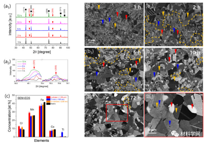图 1。分析退火材料的显微组织、相和析出物。(a 1 ) XRD 图案显示 γ 衍射峰,其中额外的小峰对应于 σ 相(红色箭头)。(a 2 ) (a 1 )中的 XRD 图案放大的 σ 相峰。σ相的峰强度随着退火时间逐渐增加。(b) (b 1 ) A600–1、(b 2 ) A600–2、(b 3 ) A600–5、(b 4 ) A600–10 和 (b 5 ) A600–72 的代表性 BSE 图像。(b 6 ) (b 5 ) 中红框所示区域的放大图) 显示析出物的形态和位置。在 BSE 图像中,红色、橙色和蓝色箭头分别表示粗大的白色沉淀物、中等大小的白色和/或灰色沉淀物和细小的深色沉淀物。再结晶和非再结晶区域的边界由橙色虚线表示。(c) A600-72 的 SEM-EDS 分析,显示了 γ 基体和三种析出物的组成。σ相、Cr-碳化物和富钛颗粒的分析颗粒尺寸分别为 1.09 m、238 nm 和 105 nm。