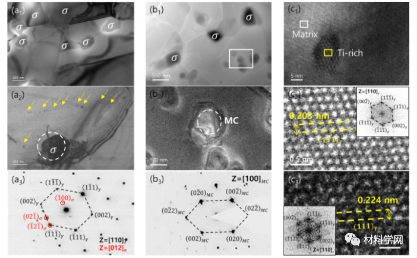 图 2。退火材料中析出物的 TEM 分析。从 A600-2 样品获得的 BF TEM 图像显示沿晶界形成的 (a 1 ) σ 相和黄色箭头指示的 (a 2 ) σ 相和纳米级析出物。(a 3 )由(a 2 )中白色虚线圆圈指示的区域获得的DP,显示对应于具有四方结构的γ相和σ相的衍射点同时存在。(b 1 ) 从 A600-2 样品获得的 STEM 图像,显示出具有暗对比度的 σ 相和主要位于晶粒内部的析出物。(b 2 ) 从 (b 1中的白框拍摄的放大的 STEM 图像)。(b 3 ) DP取自(b 2 )中的虚线圆,显示对应于MC型FCC碳化物的衍射点。(c 1 ) 从 A600-72 样品中获得的 HAADF-STEM 图像显示了纳米级沉淀物。(c 2-3 ) HAADF-STEM 图像分别取自 (c 2 ) 基质区域 ((c 1 ) 中的白色框) 和 (c 3 ) 沉淀区域 ((c 1 ) 中的黄色框)。对于两个区域都观察到 ABC 的 FCC 堆叠序列。(111) 平面的测量晶面间距对于 γ 基体为 0.203 nm,对于沉淀物为 0.224 nm。(c 2 ) 和 (c 3 )中的插图) 显示了快速傅里叶变换 (FFT) 模式,证实了两个区域的 FCC 结构。