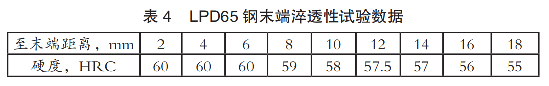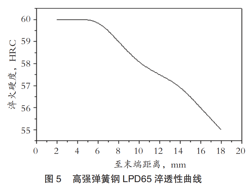表4是高强弹簧钢LPD65末端淬透性试验数据,图5是其末端淬透性试验曲线。新型高强弹簧钢LPD65具有较好的淬透性,完全能满足高应力少片板簧不同厚度原材料淬透性工艺需求。