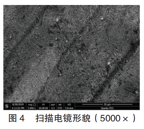 图4为高强弹簧钢LPD65热处理后扫描电镜(5000倍)形貌,在均匀清晰的回火屈氏体形貌之中,均匀弥散分布碳化物颗粒。