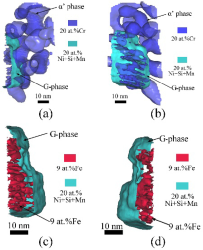 图22.G相(a,b)20at.%Cr等浓度面中Cr和Fe的分布(c,d)9at. %Fe等浓度面