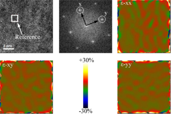 图18.通过GPA计算得到的样品中G相周围的应变分布