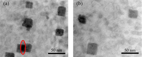 图19.通过GPA计算出的试样中G相周围的应变分布(a)时效试样,(b)退火试样