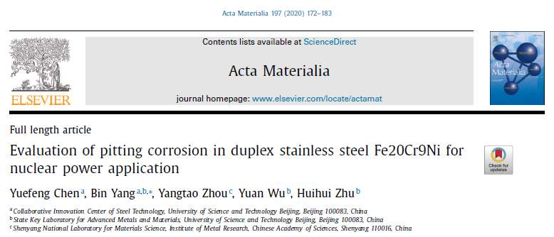 在DSSs中,铁素体相所占体积分数为12?20%的Fe20Cr9Ni双相不锈钢被广泛用于生产压水堆的一次冷却剂管道。但是,这种钢通常在会在280-320℃的长期服役期间由于铁素体相发生调幅分解发生热时效脆化,从而导致断裂韧性显著降低。许多学者系统地研究了时效对双相不锈钢力学性能的影响。然而,很少有学者研究时效对其耐点蚀性能的影响。