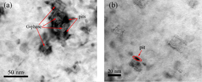 随着G相和铁素体基体之间的相干关系被破坏,失配的程度增加,界面处的应变能大于晶体内。界面处的原子具有较高的能量,因此容易与溶液中的Cl-离子反应形成点蚀坑。