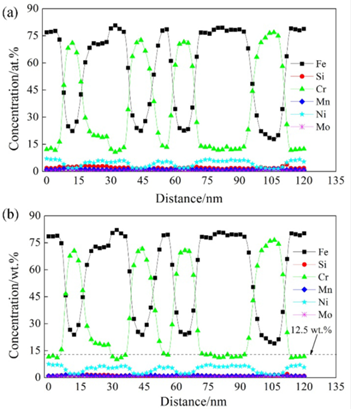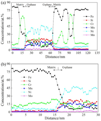 用TEM-EDS和3DAPT对3000h的时效试样中的铁素体相成分分析,表明富铁α和富铬α‘相之间的Cr元素浓度差在60℃时高达60 at%,点蚀坑没有在α相中形成。对G相和铁素体基体之间界面的成分分析表明,界面处没有贫Cr区。因此,Cr元素的组分波动不是在界面处引发点蚀的主要原因。