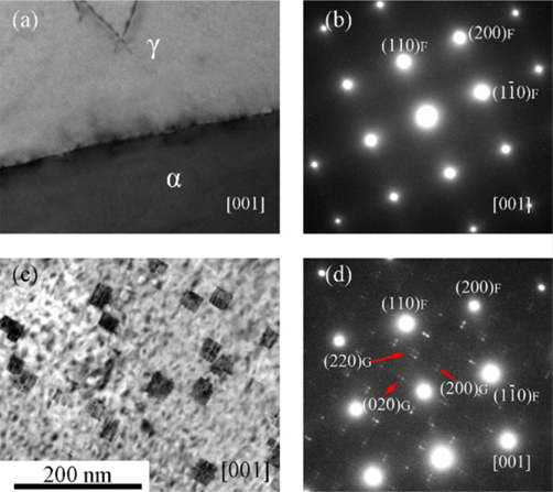 图3.TEM显微照片和相应的ED模式(a,b)为原始样品,(c,d)为时效的样品
