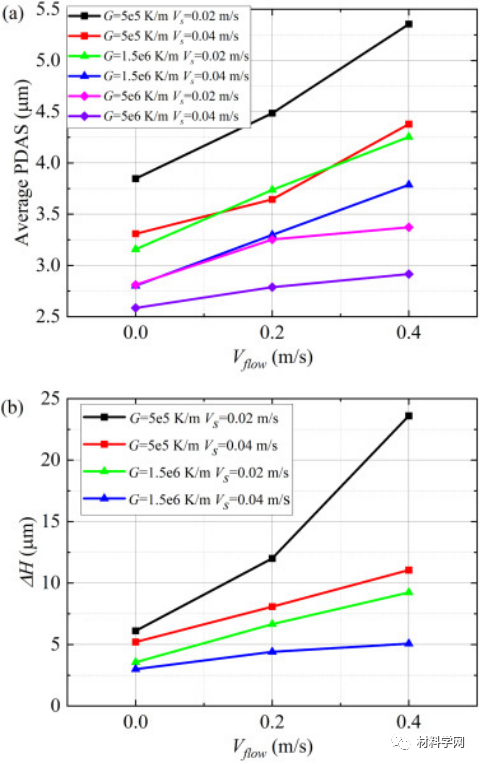 图 6.(a) 模拟枝晶结构的平均PDAS。(b) 不同凝固条件下的高度差-流速关系。当枝晶生长达到稳定状态时,测量平均PDAS和高度差。
