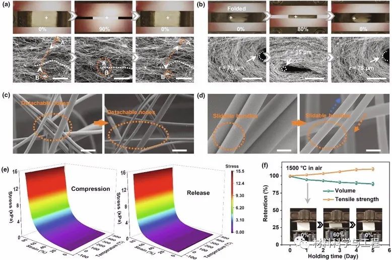 陶瓷,因其独特的物理和化学性质,在电子/光电子、生物材料、环境研究和能源等领域得到了广泛的应用。在极端环境下的保温防火领域,多孔陶瓷结构具有较高的熔点和较低的固有热导率,与碳质和聚合物材料相比具有独特的优势。然而,由于在绝大多数温度下缺乏主动弹性或韧性变形,在临界载荷下,应力主要集中在最严重的预先存在的几何缺陷(固有的或制造起源的),最终导致突然和灾难性的故障。陶瓷固有的刚性和脆性,严重限制了其在动态、冲击、无侧限载荷和高能输出条件下的扩展应用;例如,电池组热失控(TR)期间的热阻塞,毁灭性火场中的热防护,火箭发动机周围的热保护,宇航员的生命支持。