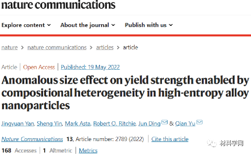 在此,浙江大学余倩老师联合西安交大丁俊老师、美国加利福尼亚州伯克利市劳伦斯伯克利国家实验室通过对单晶进行原位纳米压缩测试,量化HEA纳米颗粒的尺寸效应,研究成分不均匀性对力学性能的影响和工作尺寸范围,特别是屈服应力和加工硬化能力。如之前的研究所述,电负性和原子尺寸差异较大的元素混合物预计会在元素分布中产生更强的不均匀性,从而导致临界值增加,从而提供了实验研究局部不均匀性对机械性能影响的可能性,样本大小为d,尺寸为Lcritical。相关研究成果以题“Anomalous size effect on yield strength enabled by compositional heterogeneity in high-entropy alloy nanoparticles”发表在国际顶刊nature communications上。