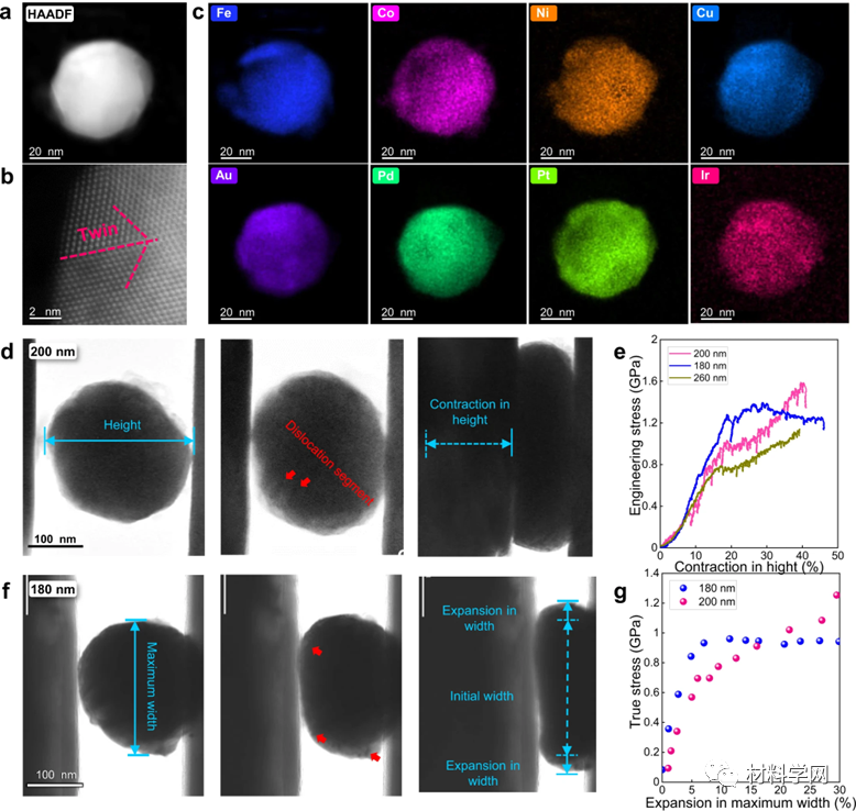 图1:FeCoNiCuPdIrPtAu纳米粒子的表征以及直径大于180 nm的粒子中的“越小越好”现象。a 显示直径为50 nm的粒子形态的HADDF图像。b HADDF-STEM图像显示了含有孪晶的粒子的原子结构(束流方向[110])。c EDS映射结果显示了八种元素在粒子中的分布情况。铜、金和钯的分布与铁、钴、镍和铂的分布相似,是互补的;请注意,纳米颗粒表面没有明显的贵元素偏析,纳米颗粒内部发生成分变化d、f 直径分别为200 nm和180 nm的大颗粒变形;这些粒子的中心几乎是电子透明的,因为它们的尺寸相对较大,而且它们的成分包含某些原子序数较大的稀有元素。e 根据对(d,f)和尺寸为260 nm的较大颗粒的测试,工程应力与高度曲线收缩之间的关系显示出“越小越强”的趋势。工程应力是根据连续记录的载荷值和使用圆柱体模型计算的直径计算的(详见方法)。g(d,f)最大宽度图中的真实应力与膨胀(应力根据实时载荷值和从提取的框架测量的直径计算)。
