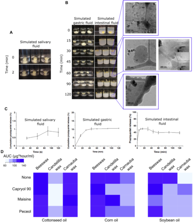 作者旨在设计具有以下特点的给药系统:(i)与疏水性和亲水性药物兼容,(ii)不需要患者吞咽大固体,(iii)不需要重构,(iv)儿童使用安全,(v)在极端温度/湿度下稳定,(vi)表现出良好的药代动力学,以及(vii)与口服和直肠给药相容。油凝胶主要由食用油制成,其稠度通过添加胶凝剂来调节。为了溶解高浓度药物,作者在油凝胶中添加了用于食品和制药行业的表面活性剂。在这项研究中的目标是确定油凝胶的每种成分可能对最终配方产生的一系列影响。然后,作者开发了四种抗感染药物(阿奇霉素、苯芴醇、吡喹酮和莫西沙星)的概念验证配方,并在猪口服和直肠给药时表征了它们的药代动力学。