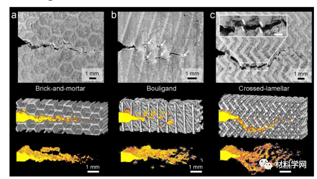 图 6:仿生 Mg-Ti 复合材料的开裂形态和增韧机制。( a ) 实体、( b ) Bouligand 和 ( c ) 交叉层状结构的复合材料的准静态断裂韧性样品的 SEM 图像和 CT 体积图。CT图像通过滤除成分信号并突出裂纹区域进行处理。( b ) 中的白色箭头表示裂纹尖端之前的微裂纹。( c )中的插图放大了锯齿形开裂路径以及由此产生的裂纹面之间的摩擦滑动,如箭头所示。