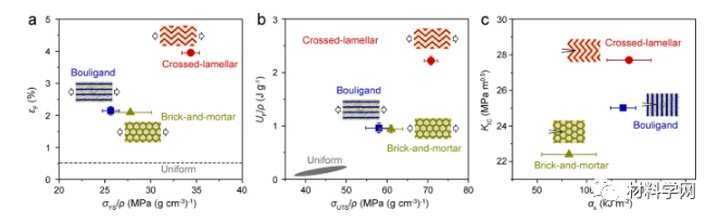 在三种仿生结构中,交叉层状结构在增强材料、离域损伤和抵抗裂纹扩展方面最有效。这种结构赋予复合材料最佳的机械性能组合,包括强度、断裂伸长率、断裂功以及断裂和冲击韧性。这主要归因于其分层性质,其中组成方向和界面的变化在不同的长度尺度上是活跃的。