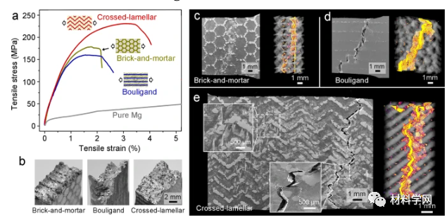 图 3:具有三种不同结构的仿生 Mg-Ti 复合材料的单轴拉伸性能和损伤特性。a拉伸工程应力-应变曲线和b复合材料的整体断裂形态,拉伸试验的加载配置在a的插图中说明。粗粒纯镁的数据也显示在(a)中以进行比较。c – e SEM 图像和 X 射线计算机断层扫描 (CT) 的拉伸样品在 ( c ) 实体、( d ) Bouligand 和 ( e ) 交叉层状结构的断裂前卸载的体积渲染。CT图像通过滤除Mg的信号并以黄色突出裂纹区域来处理。e中的插图放大 Mg 内的滑移带以及交叉层状结构复合材料中裂纹的偏转和分支
