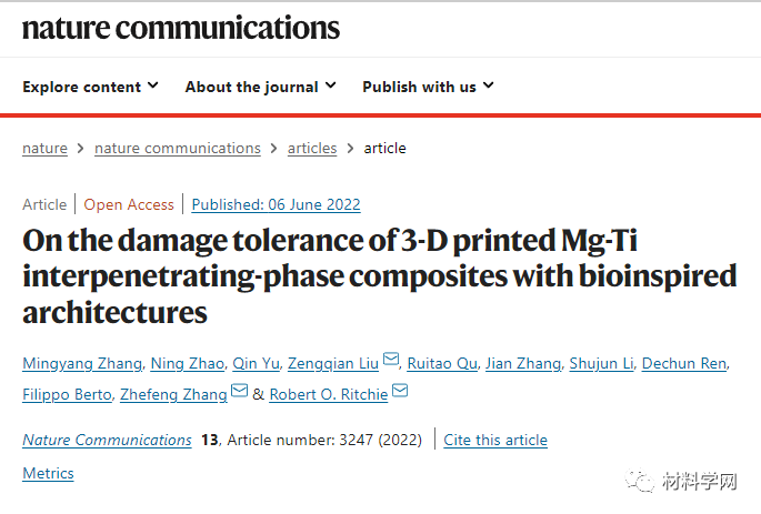 在这项工作中,这三种仿生结构是通过 3D 打印 Ti-6Al-4V 支架构建的,然后用 Mg 无压渗透形成 Mg-Ti 复合材料。该工艺利用了两种成分之间的巨大熔点差异而没有剧烈的化学反应,以及镁熔体与 Ti-6Al-4V 合金的良好润湿性。我们的目的是评估和比较这些复合材料的损伤容限,特别是强度、韧性和抗冲击性,揭示了它们的结构-性能关系,并阐明了与其特定的仿生架构相关的增韧机制。在此基础上,我们试图为仿生金属材料的建筑选择和设计提供指导。此外,我们相信我们的复合材料也可能具有结构和生物医学应用的潜力。相关研究成果以题“On the damage tolerance of 3-D printed Mg-Ti interpenetrating-phase composites with bioinspired architectures”发表在国际著名期刊nature communications上。