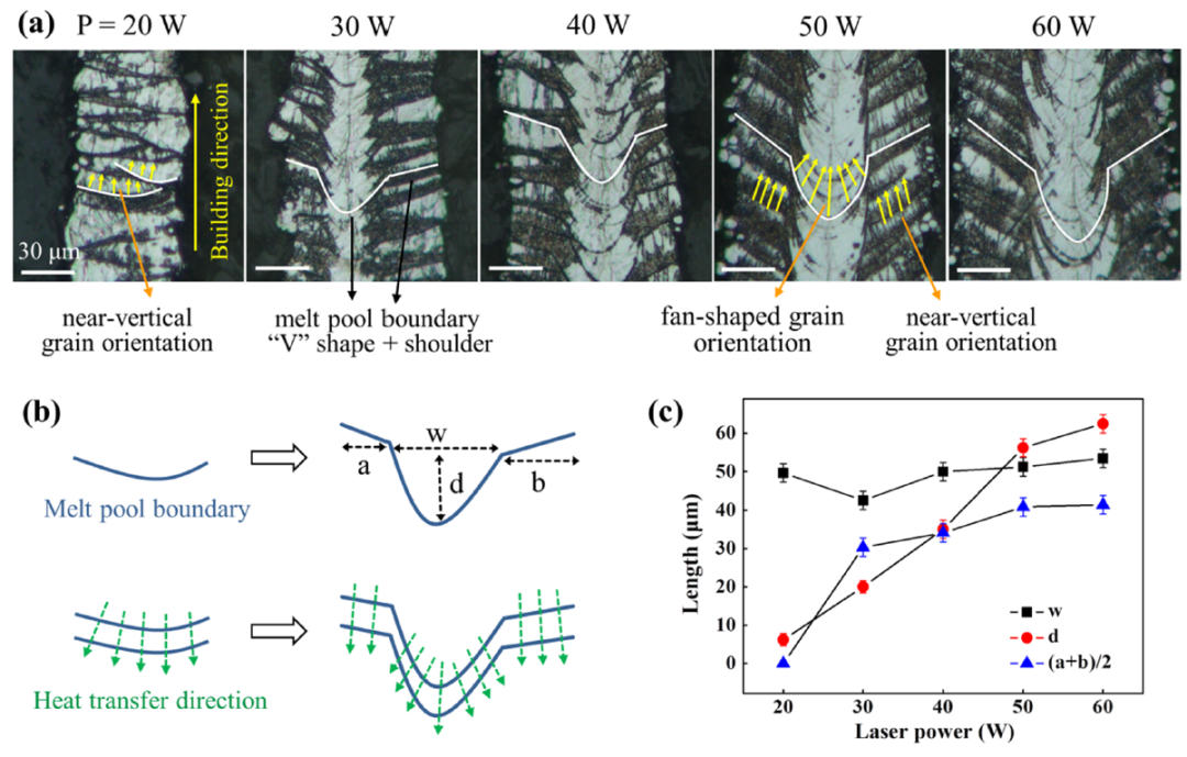 采用单道扫描制备的NiTi薄壁件,其侧面侵蚀后的熔池形貌会展现与常规LPBF块体或薄壁不一样的特征。随着功率增大,熔池边界从浅凹型逐渐变为深V型加两侧肩部。低功率时,激光冲击力度小,散热主要沿着底部已凝固金属向下传递,高功率下激光冲击力度大,熔池更深,心部散热介质主要是已凝固金属,因此会出现常见的V型,但两侧散热介质有粉末和凝固金属,且四周粉末导热远不如底部已凝固金属,因此散热方向主要沿竖直方向。成形块体材料时两侧肩部会被覆盖,常规LPBF成形薄壁时由于壁厚尺寸太大,这种肩部效应也无法呈现出来,因此这是在单道扫描模式和极小壁厚尺寸共同作用下产生的独特特征。